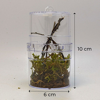 Les terrariums que je préconise sont les Critter Box, disponibles en deux tailles. Elles permettent une adaptation en douceur, avec de multiples aérations et des petits bouchons qui permettent de distribuer les mouches facilement.